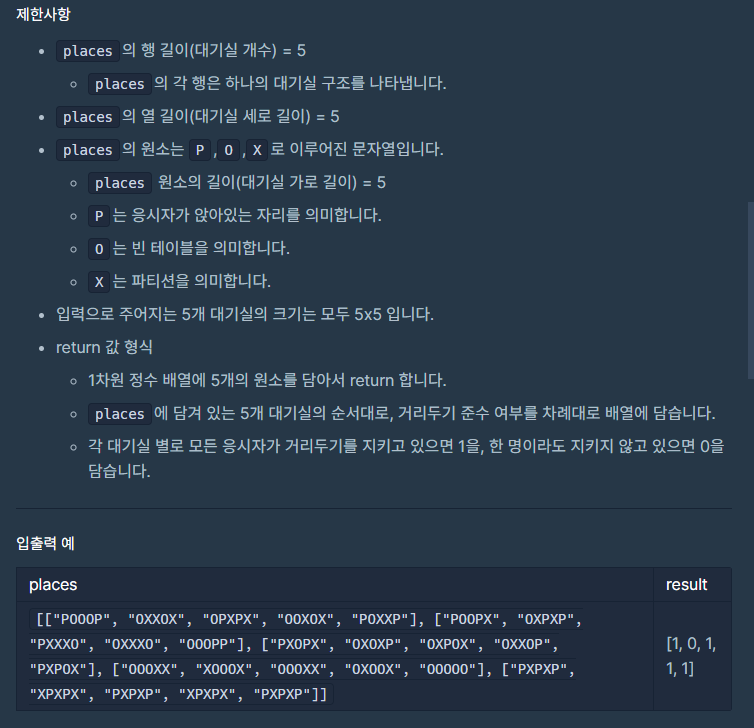 문제 이름 그대로 대기실에 있는 사람들이 거리두기를 지켰는지 확인하는 문제입니다.