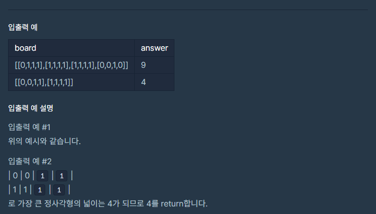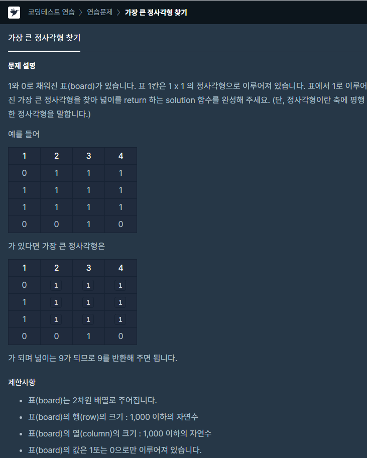 코딩테스트 연습 - 가장 큰 정사각형 찾기