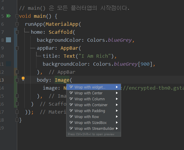 child: Image( // NetworkImage는 Url을 통해 서버이미지를 가져올때 사용합니다. 안드로이드의 Glide라고 생각!, 그밖에 AssetImage 등 다른것들도 있습니다.