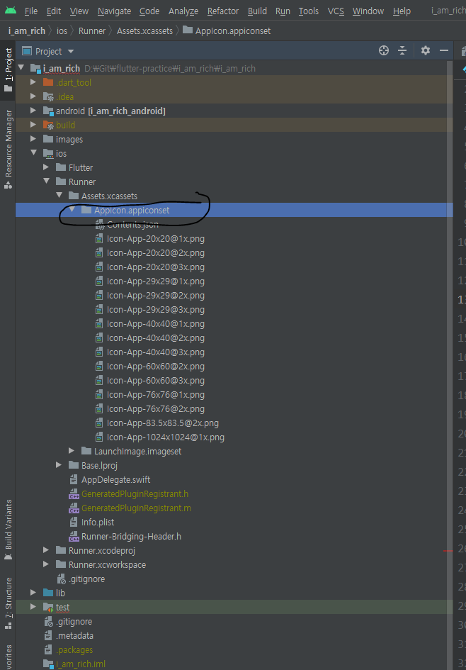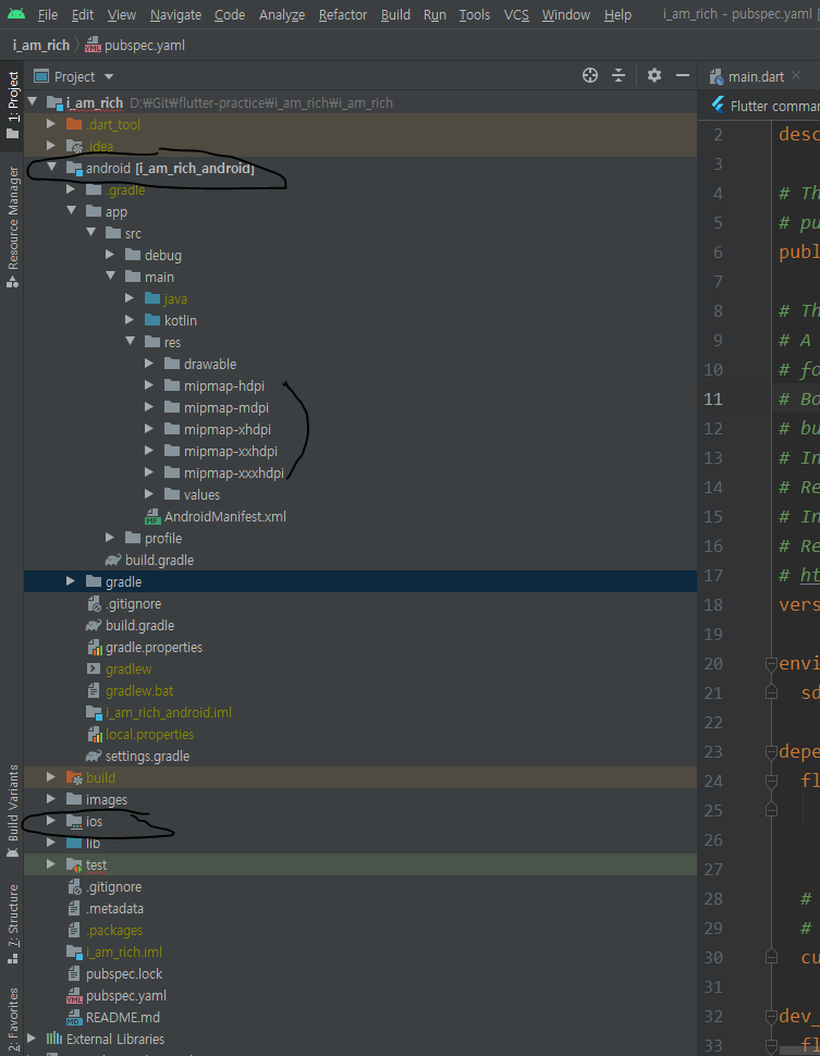 이제 앱 아이콘을 Android와 IOS에 추가해야하는데 디렉토리 구조를 보시면 Android와 IOS가 디렉토리가 보일겁니다.