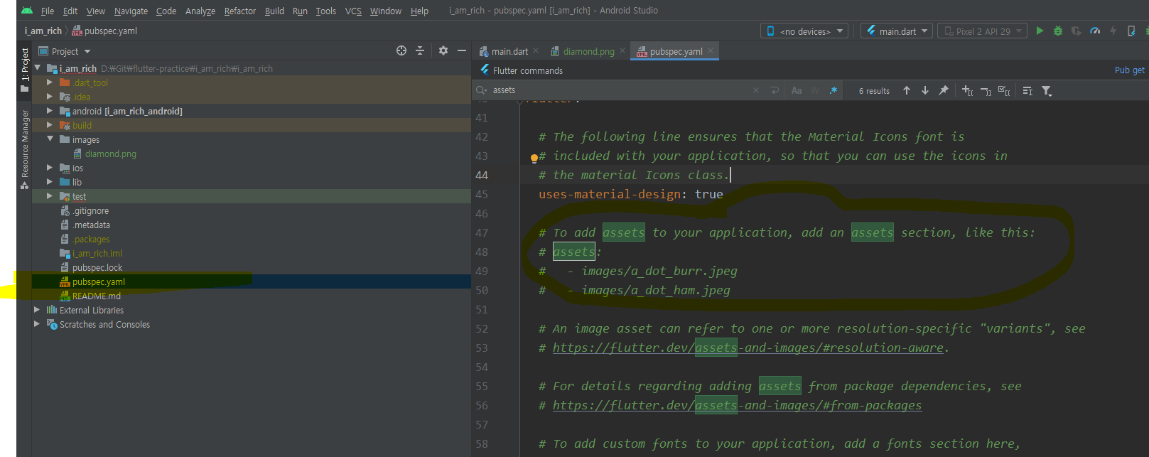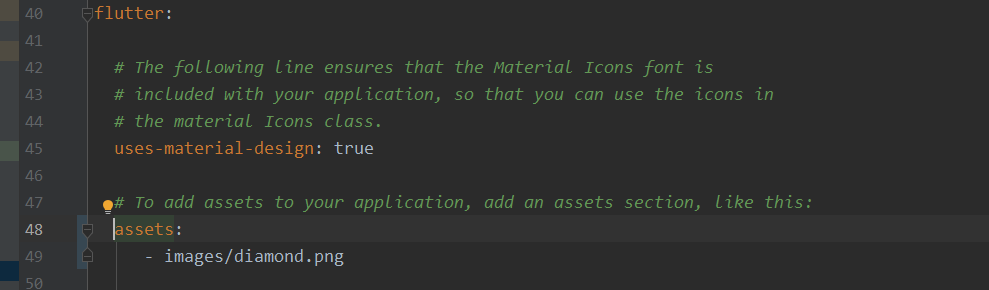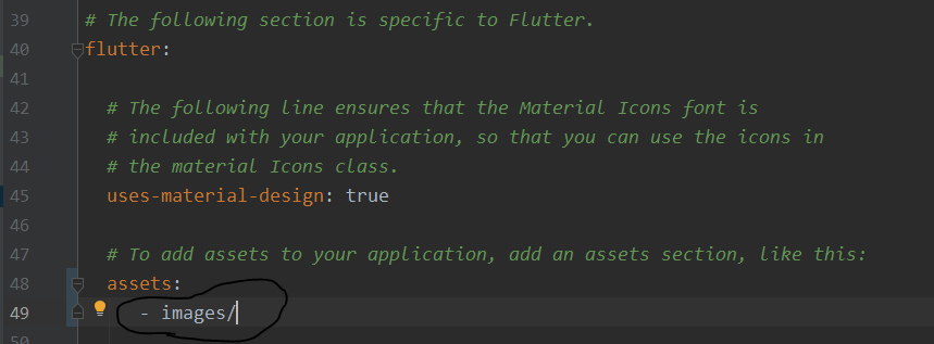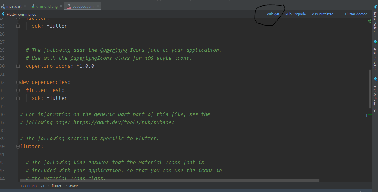 그 후 assets 을 애플리케이션에 추가해주기 위해 pubspec.yml에서 assets: 라고 주석이 되어있는 부분으로 갑니다.