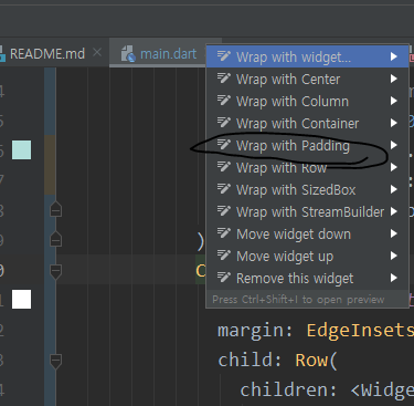 Padding 위젯은 Card 에 Alt+Enter를 하면 바로 tip이 나와서 쉽게 할 수 있습니다.