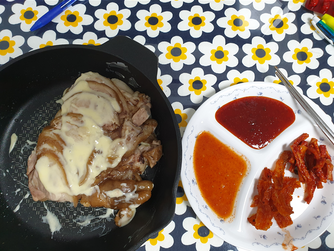 족발을 물에 중탕시키고 추가로 집에 있던 치즈를 뿌려서 치즈족발을 만들어먹어봤습니다. 전자레인지가 아니라 후라이펜에 치즈를 녹여서 뒤집다보니 비쥬얼은 좀 끔찍한데 맛있게 먹었습니다.