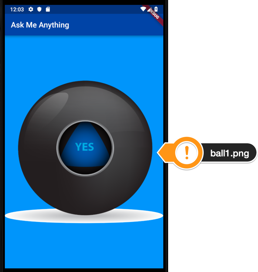 - Your Ball Stateful Widget should display a the ball1.png image. (You don't have to touch the pubscpec.yaml file)