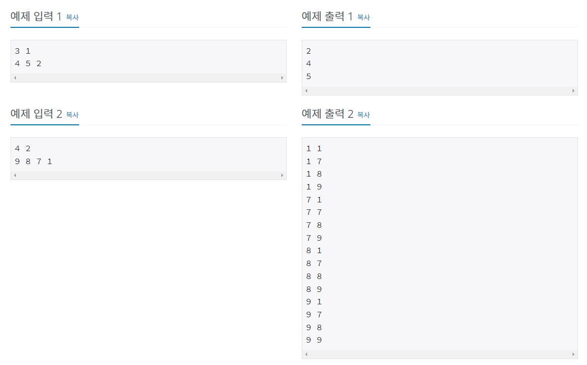 주어진 숫자를 여러번 사용할 수 있지만 오름차순으로 중복되지 않은 순열을 출력해야 했습니다.