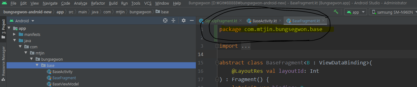 [안드로이드] 에러 해결 error: cannot find symbolpublic final class SignUpFragment extends BaseFragment<com.mtjin.bungsegwon.databinding.FragmentSignUpBinding> { symbol: class BaseFragment