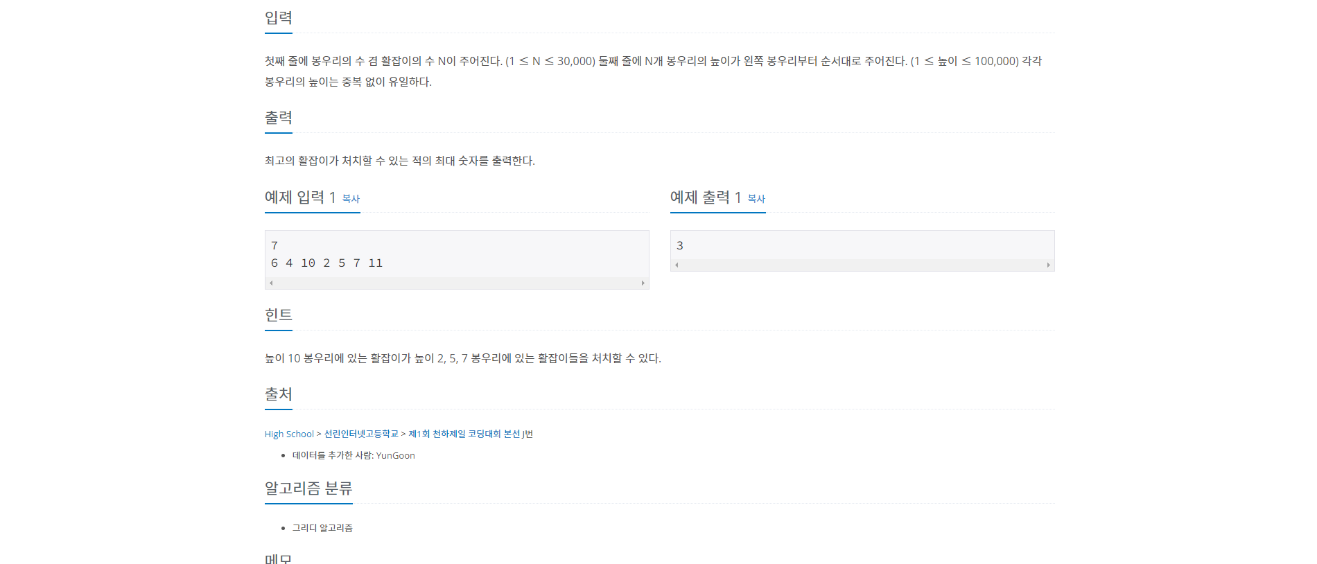 첫째 줄에 봉우리의 수 겸 활잡이의 수 N이 주어진다. (1 ≤ N ≤ 30,000) 둘째 줄에 N개 봉우리의 높이가 왼쪽 봉우리부터 순서대로 주어진다. (1 ≤ 높이 ≤ 100,000) 각각 봉우리의 높이는 중복 없이