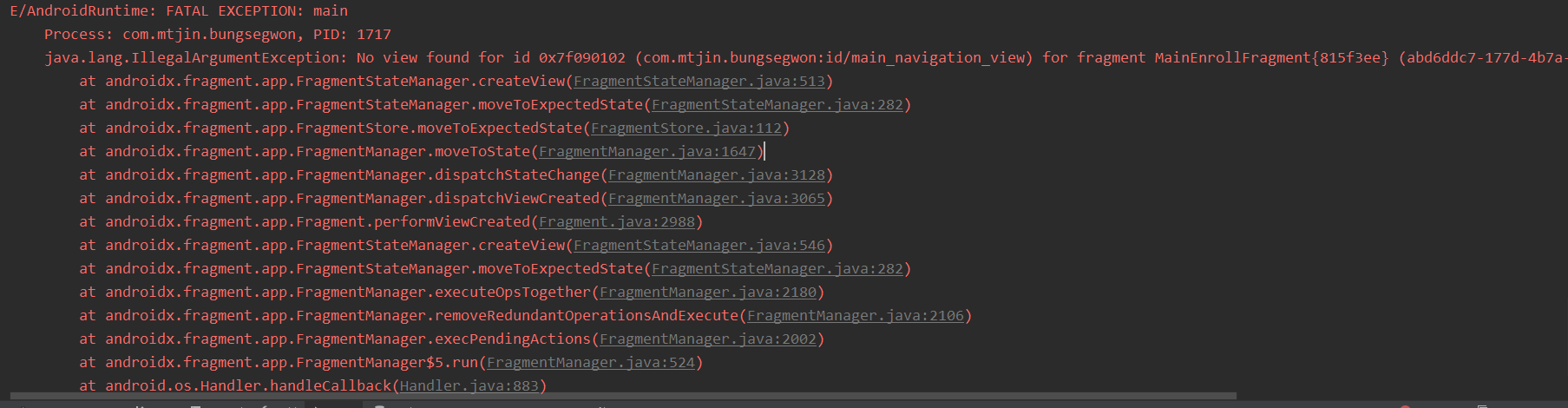[안드로이드] Jetpack Navigation Fragment 관련 에러해결 java.lang.IllegalArgumentException: No view found for id 0x7f090102 (com.mtjin.bungsegwon:id/main_navigation_view) for fragment MainEnrollFragment{815f3ee} (abd6ddc7-177d-4b7a-99a0-3d2d4..