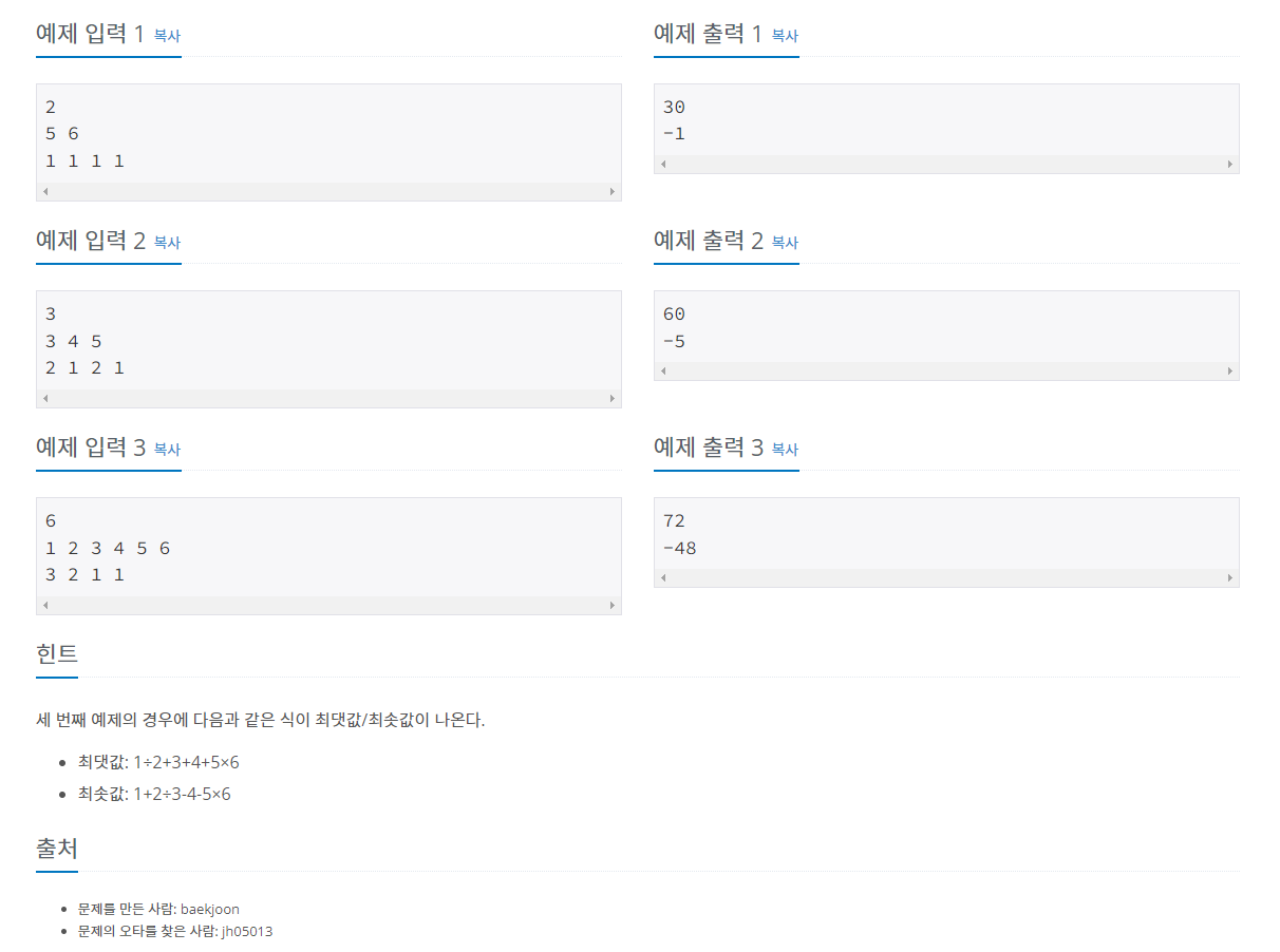 N개의 수로 이루어진 수열 A1, A2, ..., AN이 주어진다. 또, 수와 수 사이에 끼워넣을 수 있는 연산자가 주어진다. 연산자는 덧셈(+), 뺄셈(-), 곱셈(×), 나눗셈(÷)으로만 이루어져 있다. 연산자의 개수