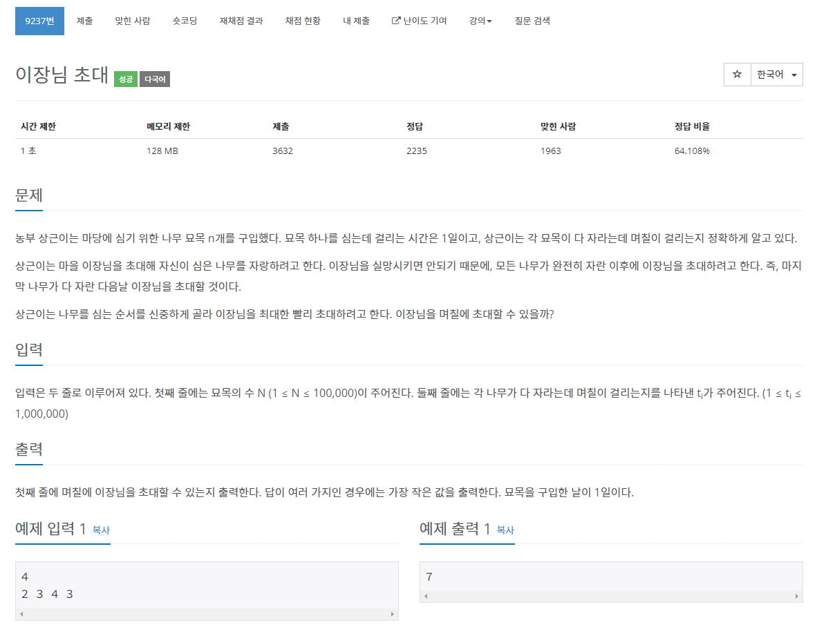 백준 그리디 유형에서 9237번 이장님 초대라는 문제를 풀어봤습니다. ㅎㅎ
