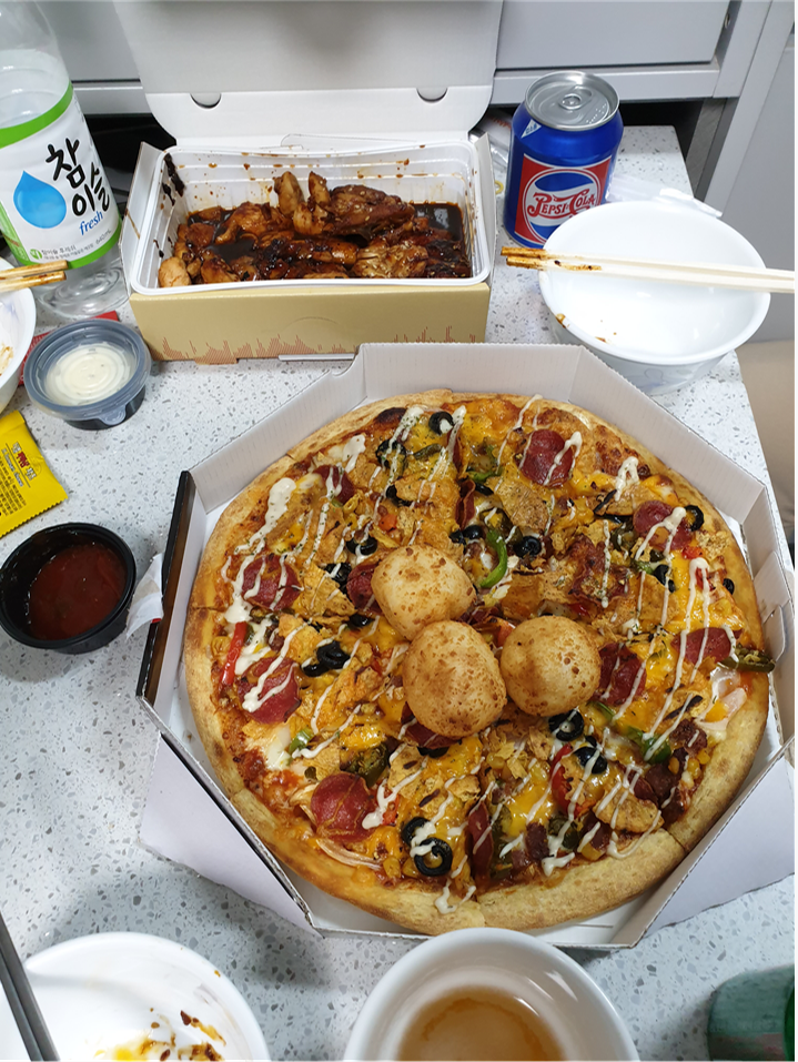 평일에 친구들과 자취방에서 지코바와 옐로우 피자를 먹었다.