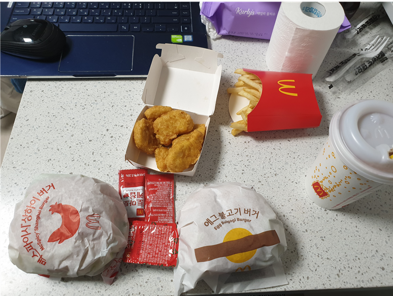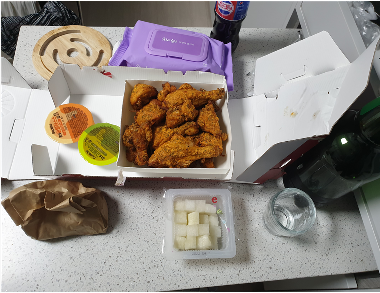 그래서 집에 있는 고기와 배달음식을 먹으며 휴식을 취하고 있다.
