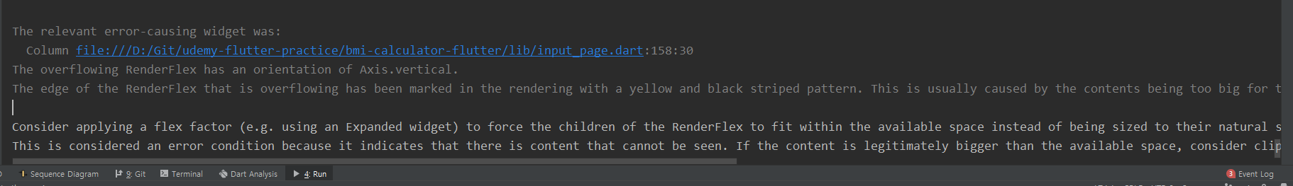 The overflowing RenderFlex has an orientation of Axis.vertical.The edge of the RenderFlex that is overflowing has been marked in the rendering with a yellow and black striped pattern. This is usually caused by the contents being too big for the RenderFlex.
