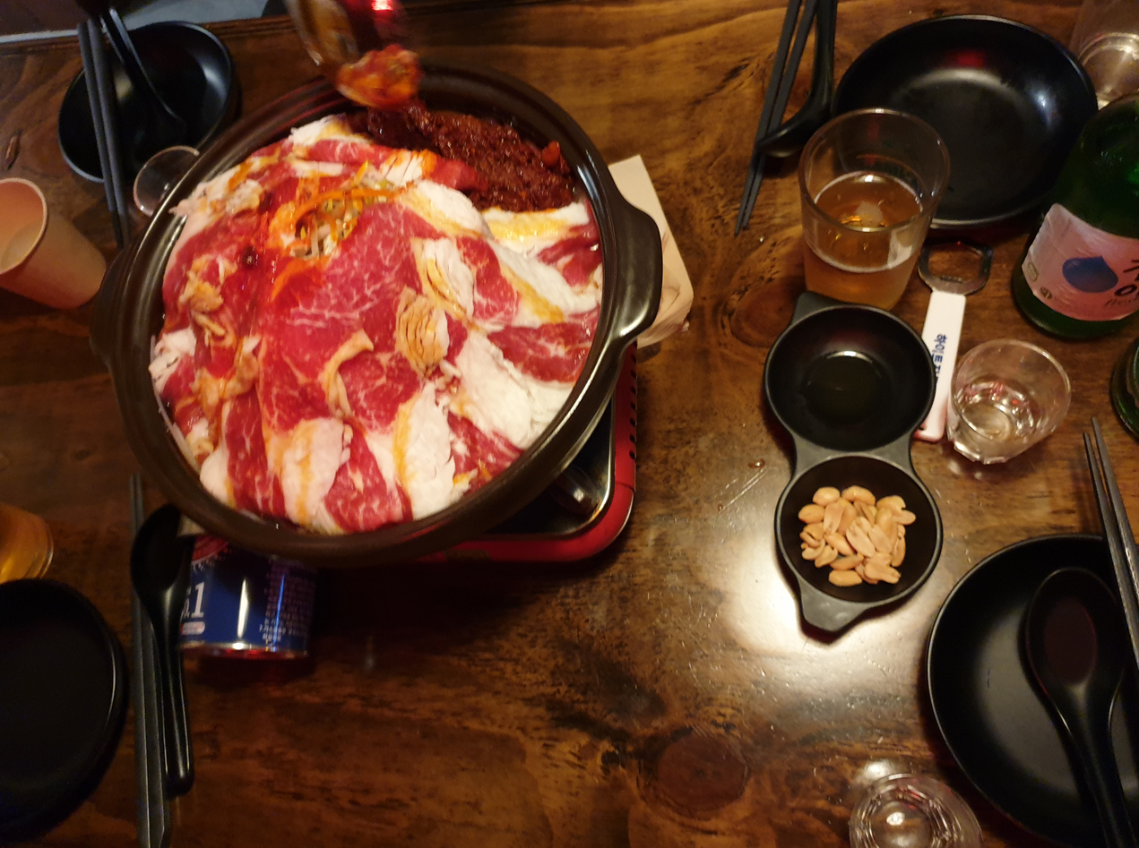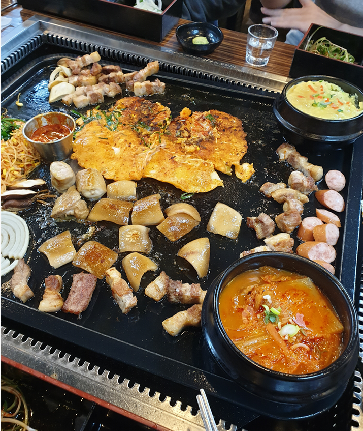 사진은 다 못찍었지만 소세지, 삼겹살, 곱창, 냉면, 과일, 부침개, 찌개 등 코스처럼 다양한 음식이 나와서 되게 특이한 고기집이었다.
