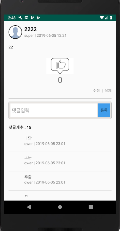 그런데 그냥 스크롤뷰와 리사이클러뷰를 사용시 이중스크롤이 발생하는데 댓글 칸이 두세개밖에 안보이고 15개의 댓글을 두세개만한칸으로 스크롤을 해서 봐야하는 문제가 발생하였습니다. 만약 게시물이 전체화면을 넘어가면?? ㄷㄷ..