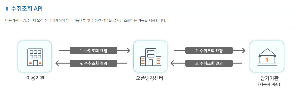 그리고 이체단계에서는 입금될 계좌에 대한 수취조회가 먼저 이루어지고 출금이체와 입금이체 API 가 함께 사용된다는 점을 보는것이 중요하다.