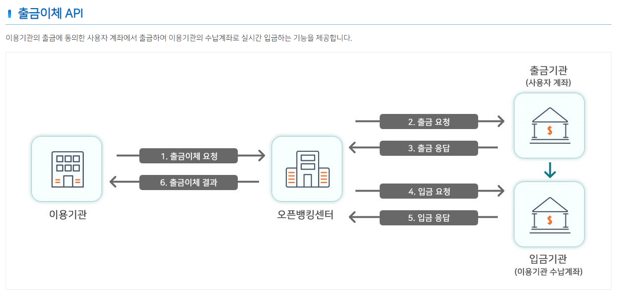 입금이체 API와 반대로 출금이체 API는 거래를 일으키는 주체(이용기관)가 타기관(출금기관)에 출금을 요청하여 입금기관(이용기관) 계좌에 입금을 하게 된다.