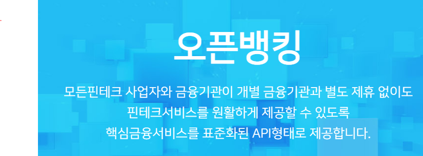오픈뱅킹이란 모든핀테크 사업자와 금융기관이 개별 금융기관과 별도 제휴 없이도 핀테크서비스를 원활하게 제공할 수 있도록 핵심금융서비스(수취조회, 거래내역조회, 이체성 등)을 표준화된 API 를 제공하는 것이다.
