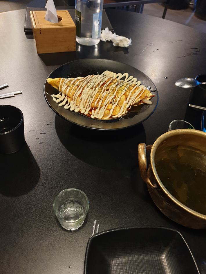 메뉴로 이번에는 회는 안시키고 별빛청하와 함께 무슨 면과 모듬튀김을 시켜먹었다.