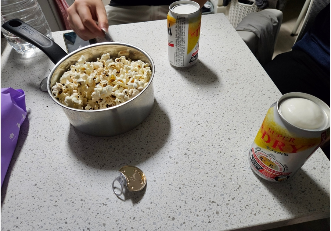 3차로는 남자들끼리만 내 자취방에 와서 아사히 생맥주와 함께 팝콘을 튀겨먹었다.