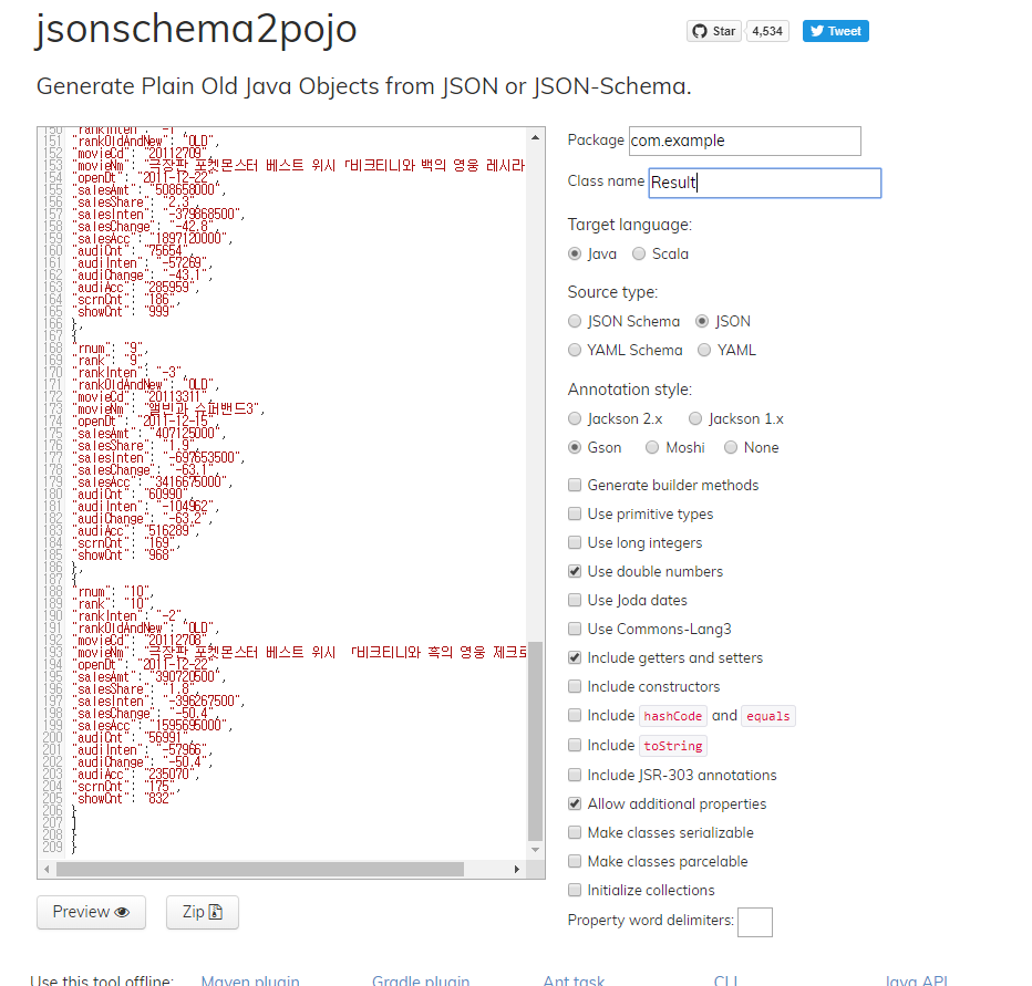 http://www.jsonschema2pojo.org/ 불러오는 중입니다... 몽고디비같은 경우는 맨 밑의 Property word delimiters를 공백으로 해줘야 에러가 안난다고한다.