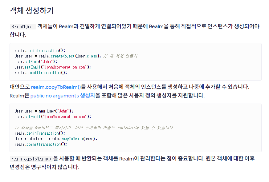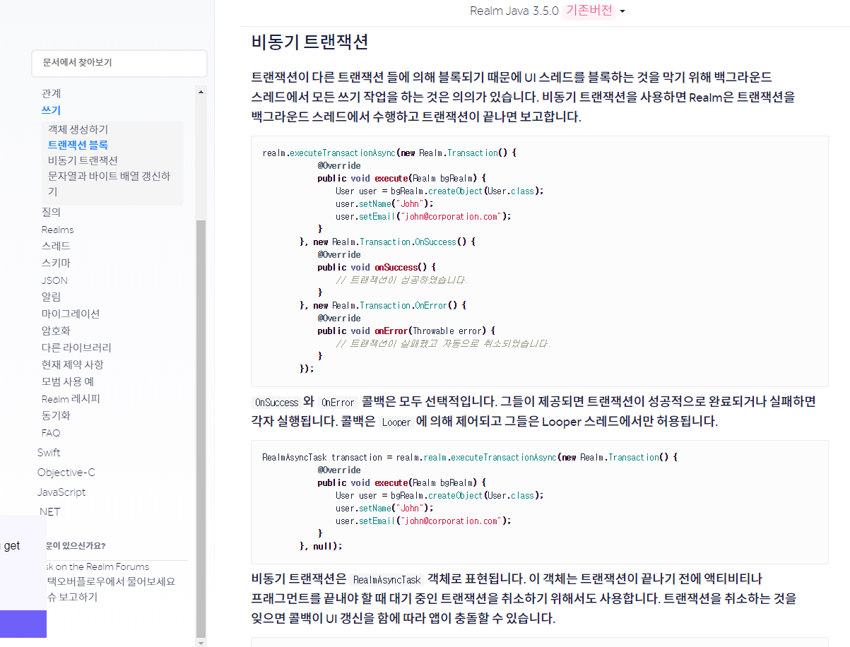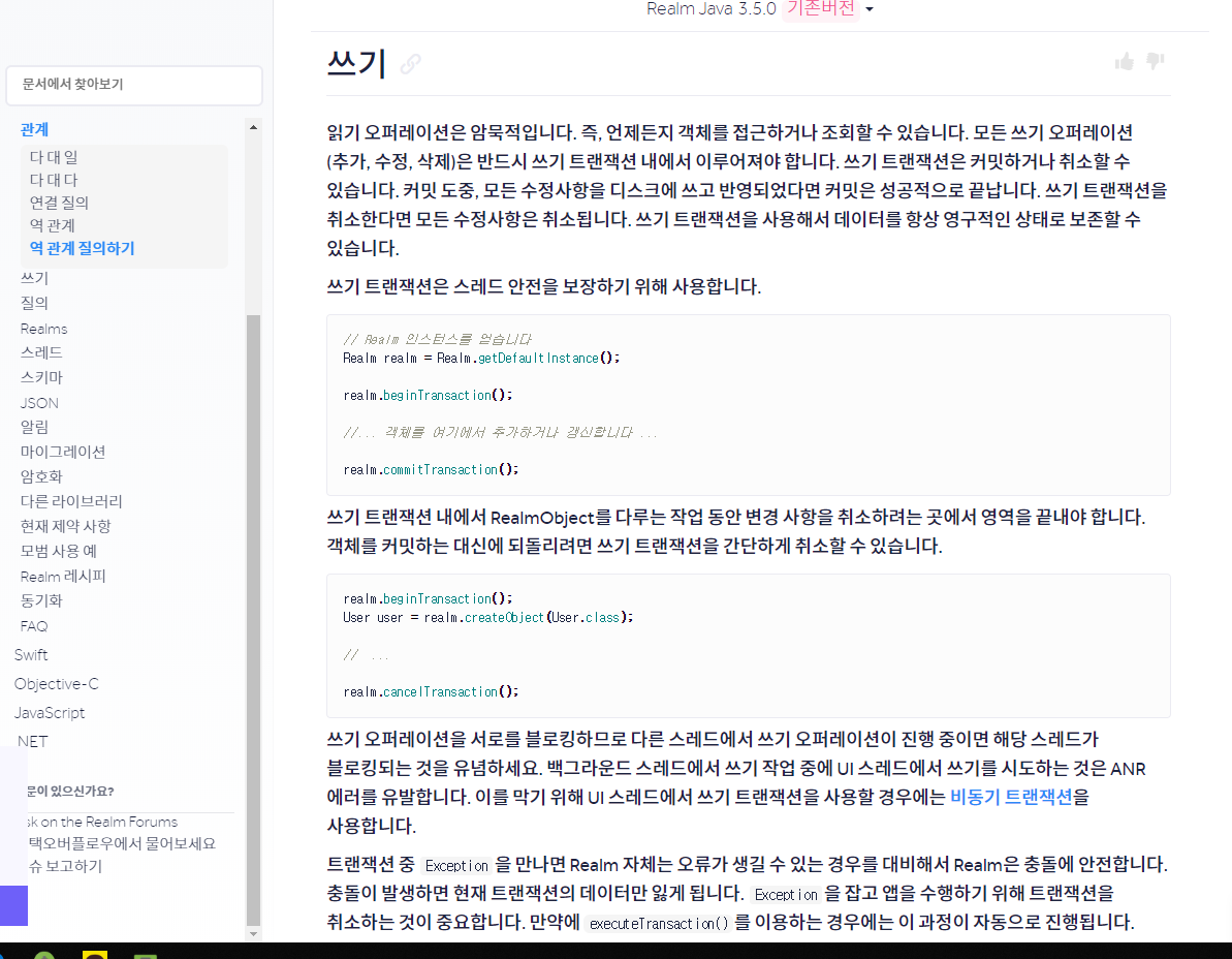 밑과 같은 차이점이 있다고 한다. 자세한건 Realm사이트의 '쓰기' 부분을 보면됩니다. 트랜잭션 관리와 디비저장방법 추가자료.(밑)