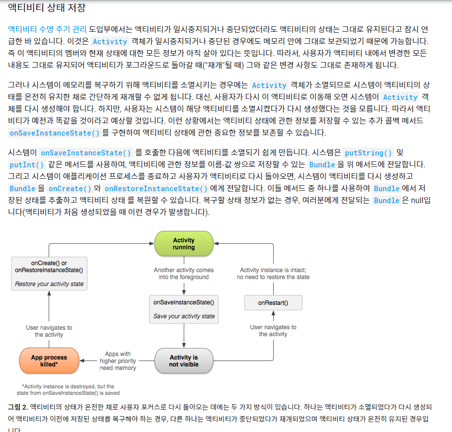 그리고 백그라운드로 들어간 액티비티는 시스템이 메모리 리소스가 부족한 경우 언제든지 백스택에서 제거될 수 가 있다. 이런 경우 해당 액티비티가 원래 재개되었을 때 기존에 쓰고있던 기록이나 정보들이 유실될 수 있다. 즉 onPasue와 기본 생명주기 상태를 기록하는게 힘들 수 있다. 그런 경우 onSaveInstanceState()를 사용하면된다 이에 대한 정리는 밑 그림과 내용을 참고하도록한다.