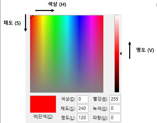 V(명도)는 색상의 밝은 정도를 의미한다. 검은색을 0으로 했을 때 값이 커질 수록 색상이 밝아진다.