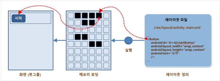 이렇게 XML 레이아웃 파일의 내용이 메모리에 객체로 만들어지면 소스 코드에서는 그 객체들을 찾아 사용할 수 있습니다.