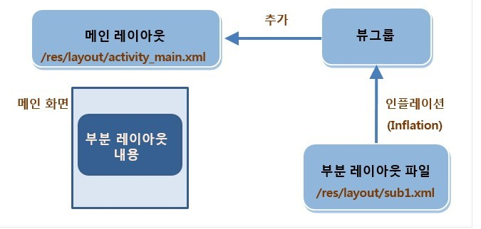 위 그림을 보면 이해하기 좀 더 수월할 것입니다. 메인화면 즉 메인액티비티와 그에 포함되는 메인XML파일이 있을 것입니다. 메인 액티비티는 메인XML을 setContentView()를 통해 인플레이션 했기 때문에 사용할 수 있습니다. 그러나 다른 부분 레이아웃 파일인 sub1.xml 파일의 뷰객체들은 갖다가 사용하지 못할 것입니다. 왜냐하면 인플레이션이 안되었기 때문입니다. 그래서 위에서 한것과 같이 getSystemService()메소드로 레이아웃인 인플레이터 객체를 참조하고 sub1의 xml을 인플레이션 해주어 사용할 수 있게 만들어줍니다.