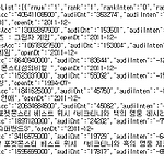 json 포맷이 다음과 같이 일렬로 쭉 늘어져있는 경우 가독성이 떨어진다. 이런 포맷을 보기좋게 바꿔주는 사이트가 있다.JSON VIEWER라는 사이트이다.주소 : http://jsonviewer.stack.hu/#http://www.kobis.or.kr/kobisopenapi/webservice/rest/boxoffice/searchDailyBoxOfficeList.json?key=430156241533f1d058c603178cc3ca0e&targetDt=20120101 사용방법(심플하게!) 1. 먼저 위에 사이트에 접속한다음 TEXT에 JSON포맷의 문자를 복사 붙여넣기 해준다. 2. 그 다음 2번째 줄 탭에 있는 FORMAT을 클릭해준다. 그럼 다음과 같이 보기 좋게 바꿔준다. 복잡하고 보기힘들게 ..